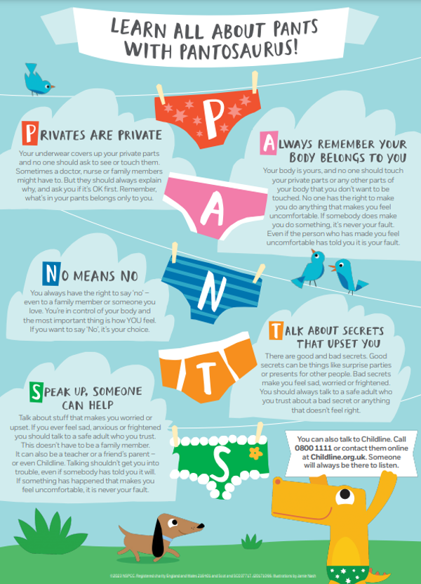 Developed in consultation with children, parents, carers and teachers, Talk PANTS is here to help children understand their body belongs to them, and they should tell a safe adult they trust if anything makes them feel upset or worried.